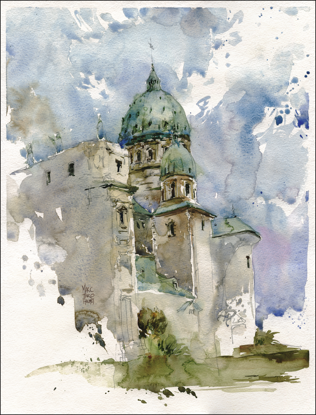 My method for this sort of “architectural portrait” always begins with a structural drawing. You have to go slow in order to go fast. A painting on location might take two or three hours, depending on complexity. People are surprised to hear I spend at least half the time on the under drawing.