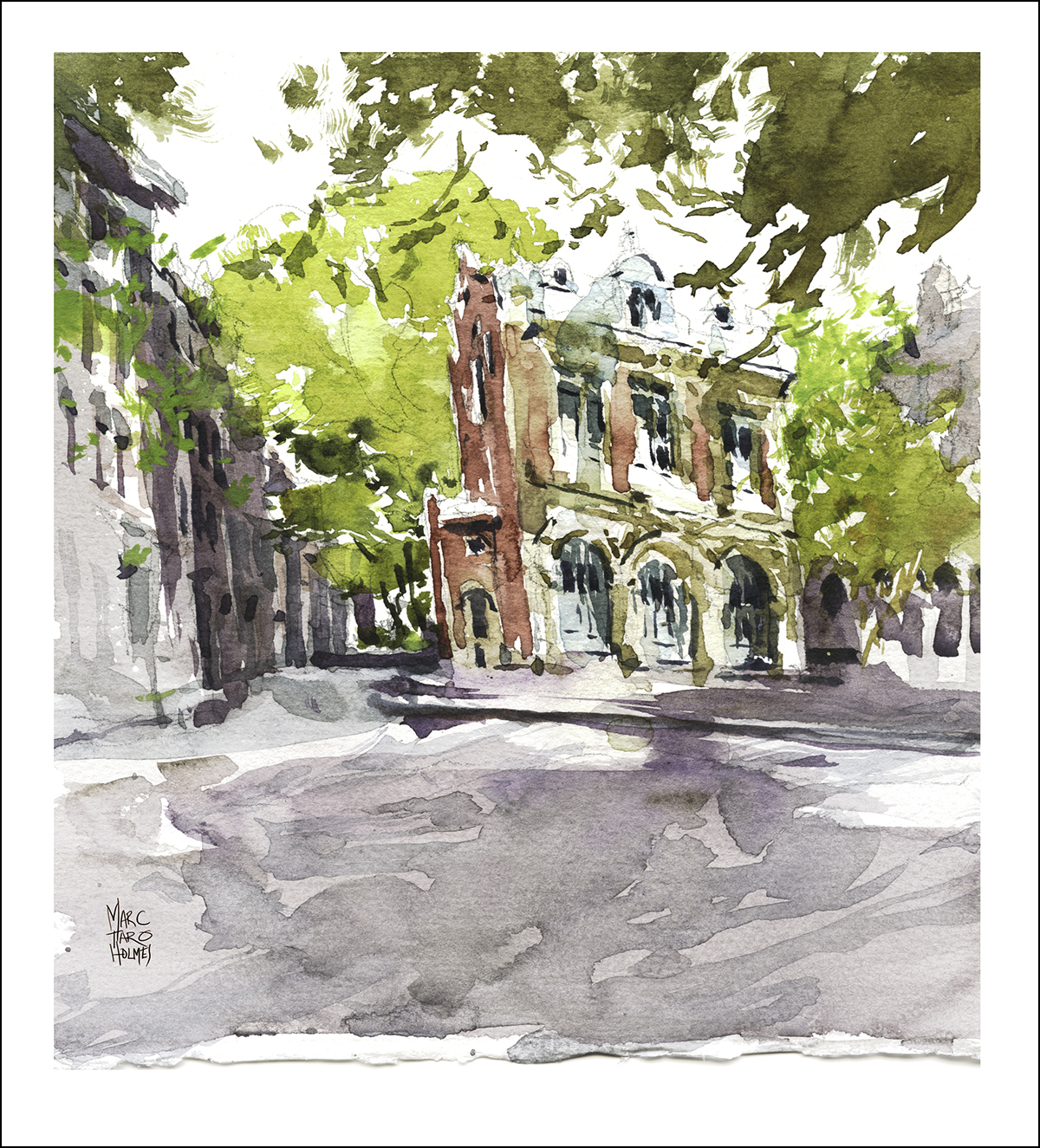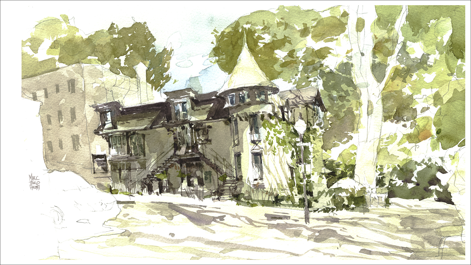 One of my favorite sketching spots in Montreal is the Caserne Centrale de Pompiers – the old Firefighters Barracks. A quaint little turn-of-the-century structure, featuring three tiny garage doors meant for horse and carriage fire engines.