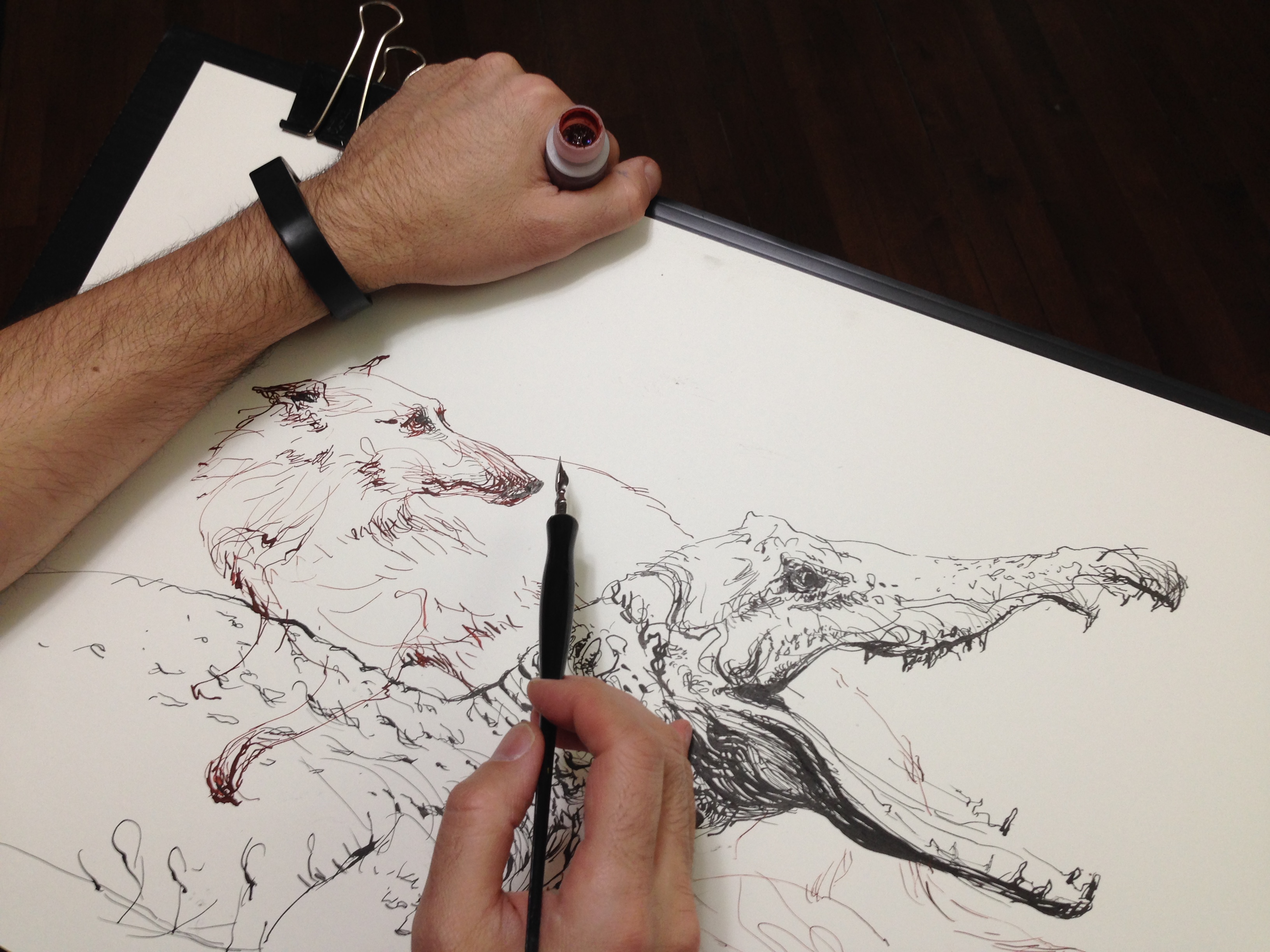 Hi Marc, I have a question for you, do you work at an easel? I’m having trouble finding a good ink pen or dip pen nib that works when I draw at an easel and the paper is vertical. I’ve tried dip pens and ink; micron pens and Faber Castell Pens.