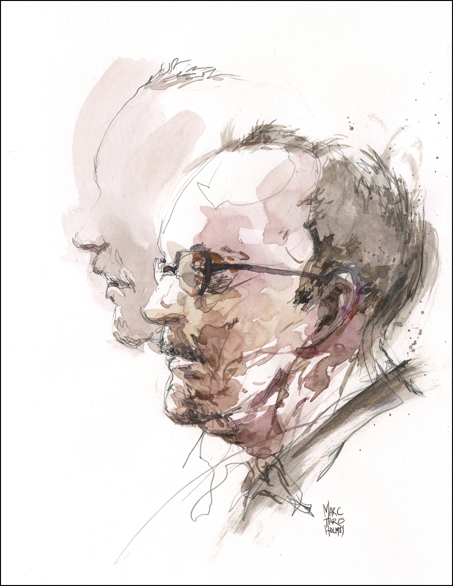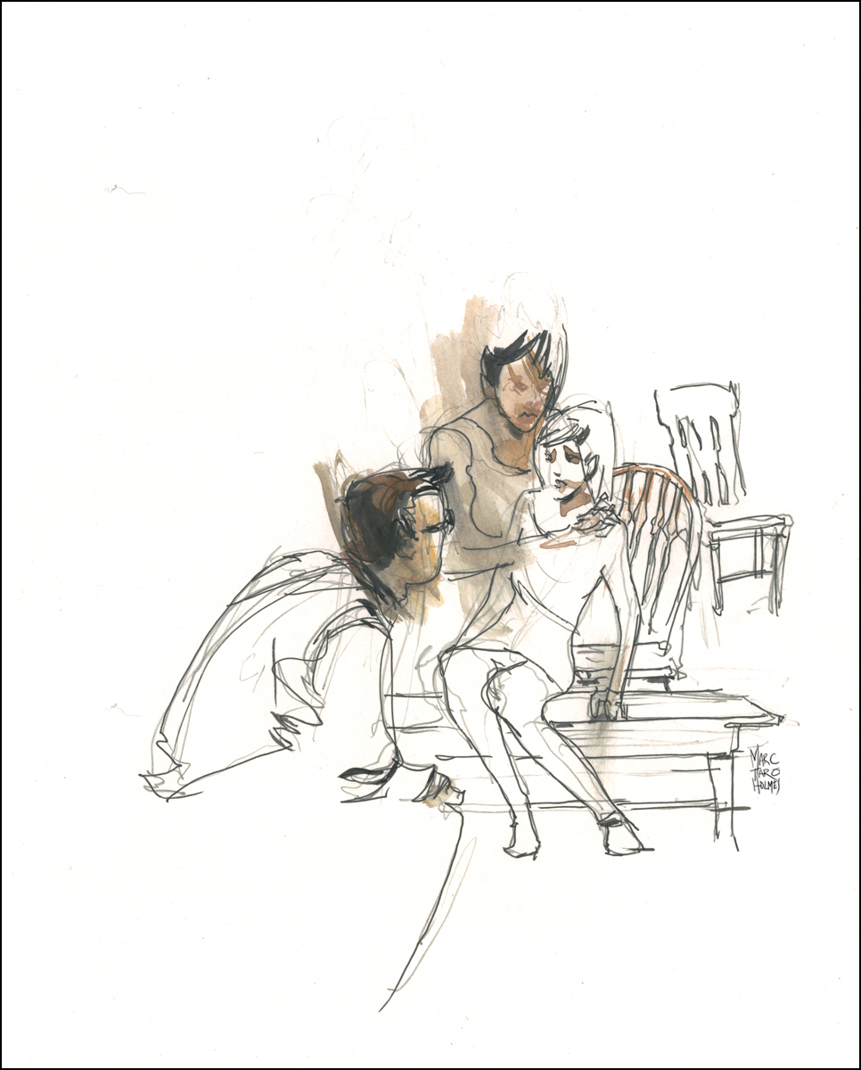 Director Roy Surette and the cast have given me the unique opportunity to attend rehearsals with my sketchpad. I’ll be drawing live while the actors go about the work of building the characters and story. The drawings are both a document of the actors at work, and a visualization of the story they conjure from the page.