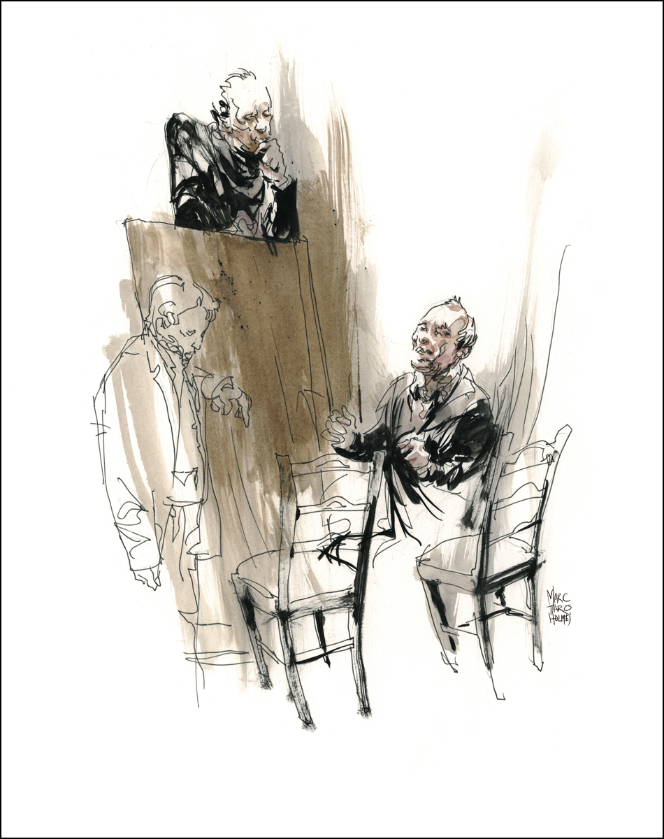 In the first few sessions, I’ve been sketching rapidly. Trying to memorize faces as the actors read, re-read and discuss the text. They call the first few days ‘Table Work’ – for reasons that became fairly clear. It was very much like watching a jury deliberate for hours. Everyone trying to determine, what does my character know at this point? Who knows what rumors, what are the police doing, how did events move so quickly to their bizarre conclusion.