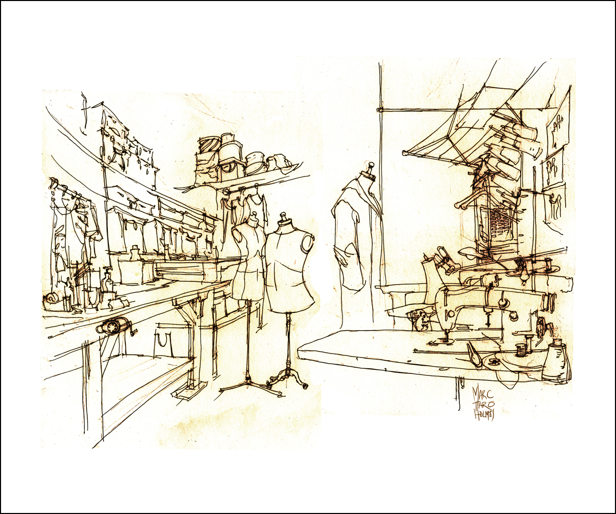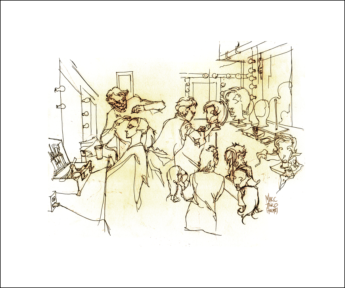Marc – what wonderful work and very inspiring! I would very much appreciate it if you would tell me what pen you use for your cast group sketches, costume shop, etc. and also for the stunning exterior theatre/stock exchange drawing. Love your drawings. Thanks