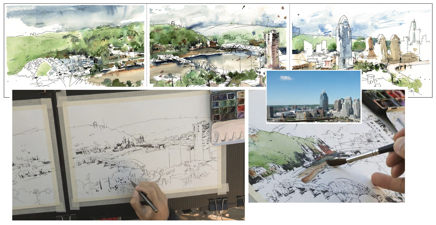 Episode three of my Artist Network sketching series is on sketching panoramic views. In this demonstration we visited a rooftop balcony with a uninterrupted view of the Cincinnati skyline, so I can show you the method I call Post and Rail Panoramas.